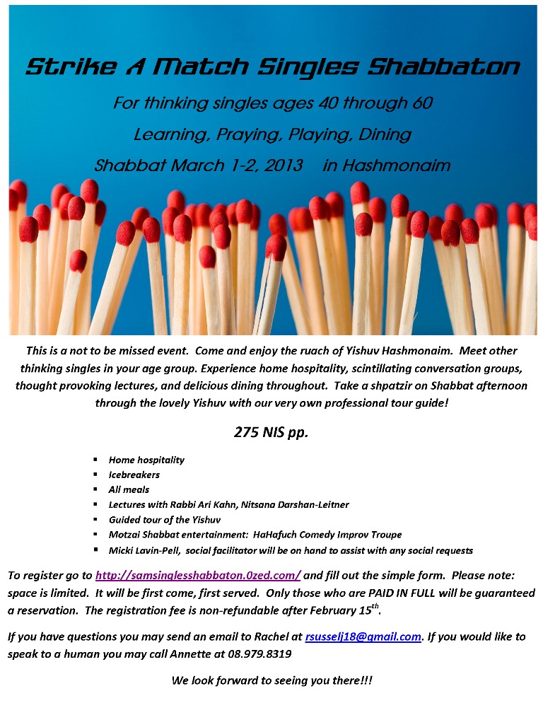 Strike A Match Singles Shabbaton For thinking singles ages 40 through 60 Learning, Praying, Playing, Dining Shabbat March 1-2, 2013 in Hashmonaim